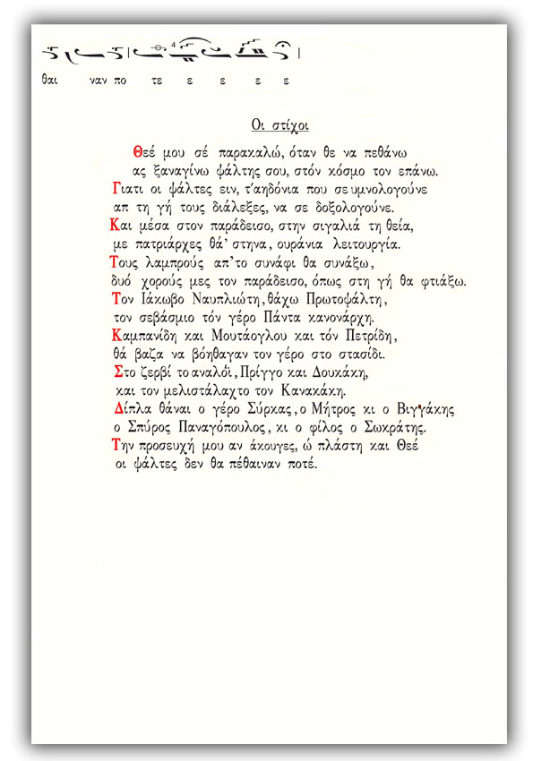| ΨΑΛΤΟΤΡΑΓΟΥΔΑ (Προλεγόμενα της α΄ έκδοσης) Ύστερα από την καλή υποδοχή, που επεφύλαξαν οι συνάδελφοι και φίλοι στα "ΨΑΛΤΟΤΡΑΓΟΥΔΑ" - που ήταν και η πρώτη συνθετική δουλειά μου, είχα πάρει την απόφαση να τα εκδώσω σ' ένα μικρό βιβλιαράκι, γιατί πάρα πολλοί συνάδελφοι τα ζητούσαν επίμονα σε βυζαντινή σαμειογραφία. Στην απόφαση αυτή κατέληξα, πρώτα για να ικανοποιήσω την παράκληση των καλών αυτών φίλων και δεύτερον, γιατί επιθυμούσα το έργο μου αυτό, το μικρό και ασήμαντο, να έπαιρνε μια μικοή θέση κοντά στις τόσες μουσικές εκδόσεις. Όμως στο αμέσως επόμενο χρονικό διάστημα που εμεσολάβησε, είχα αρχίσει να δημιουργώ μια καινούργια ποιητική σειρά, που ένα μέρος της αναφέρονταν στον ψάλτη, που λειώνει τον εαυτό του μέσα στον χώρο της εκκλησίας, στον ψάλτη που έχει ερωτευθεί το λειτούργημά του και το έχει κάνει σκοπό της ζωής του. Στον γεμάτο μεράκι και ευθύνη για τον αγιασμένο αυτόν χώρο, στον πεισματάρη συνεχιστή της εθνικής μουσικής παράδοσης, και ακόμα στον ακρίτα που αγωνίζεται επίμονα, αντιπαλεύοντας την αδιαφορία του σε απόλυτη άγνοια ευρισκόμενου δυστυχώς κράτους μας, μα και αυτής της ίδιας της εκκλησίας. Η ιδέα που έχω σχηματίσει για τον ψάλτη, η αξιολόγηση της προσφοράς του μέσα στο χώρο της θείας λατρείας, ήσαν τα ερεθίσματα που σιγά σιγά τα ένιωσα σαν δίκο μου χρέος και οφειλή, που επίμονα ζητούσαν την ευκαιρία για εξόφληση. Ακόμη, το γεγονός ότι πλήν του αγίου της τάξης μας, δηλαδή του Αλέξανδρου Παπαδιαμάντη και του μεγάλου ποιητή μας Κωστή Παλαμά, κανένας άλλος δεν είχε ασχοληθεί με την προσωπικότητα του ψάλτη (λες και το έργο του ήταν μηδαμινό και ανάξιο λόγου) είχαν γίνει για μένα μια μεγάλη και ασταμάτητη πρόκληση. Αυτή την σιωπηλή αδιαφορία Κράτους και Εκκλησίας, την έβλεπα σαν προσβολή και αδικία συνάμα, στο πρόσωπο του ψάλτη και του έργου του σαν μια διαρκή παραβίαση αυτής της ίδιας της αλήθειας. Σαν μια σκόπιμη αποσιώπηση της ύπαρξης του. Με αδιάκοπη τη σκέψη στο χρέος αυτό, άρχισα να δουλεύω στα ποιήματα αυτά με σκοπό να τονίσω την προσωπικότητα και το έργο του και ακόμα να υπενθυμήσω το μέγεθος και την αξία της προσφοράς του. Τα ποιήματα αυτά, τα πέρασα στην βυζαντινή σημειογραφία, ενώ πρόσφατα και το οργανικό μέρος γράφοντας το στην αυτή σημειογραφία. Την καινούργια συνθετική δουλεια μου, την έχω αφιερώσει από την στιγμή της σύλληψης σαν ιδέα, στην ιεροψαλτική οικογένεια, την τόσο μεγάλη σε αξία, την τόσο αδικημένη την τόσο παρεξηγημένη μα και την τόσο αντιφατική γύρω από τον εαυτό της. Τελειώνοντας το έργο, τόσο στο ποιητικό όσο και στο μουσικό μέρος, έκρινα σωστό να τα εκδώσω, ενοποιώντας τα σε ένα τευχίδιο, δηλαδή τα παλαιά ψαλτοτράγουδα και τα καινούργια, με τον γενικό τίτλο: " ΨΑΛΤΟΤΡΑΓΟΥΔΑ" Η καινούργια δουλειά μου όπως και η παλιά είναι σύμπραξη ψάλτη και βυζαντινών παραδοσιακών οργάνων δηλαδή όσων χρησιμοποιούν την φυσική κλίμακα. Διάλεξα αυτή τη σύμπραξη, γιατί κατέχομαι από την έμμονη σκέψη και πεποίθηση συνάμα, ότι η βυζαντινή μουσική, μένοντας έξω από τις οργανικές δυνατότητες από λόγους δογματικούς και μόνο, έχει στερηθεί, έχει χάσει ένα μεγάλο μέρος από την ομορφιά της, την βαρύτατα της , το εύρος της. Η μουσική μας που κατά την άποψη μου είναι η εκφραστικότερη μουσική πραγματικότητα στην ερμηνεία και των πιό βαθειών ανθρωπίνων συναισθημάτων, έμεινε αγνοημένη από το μεγάλο μέρος του ελληνικού λαού, γιατί 